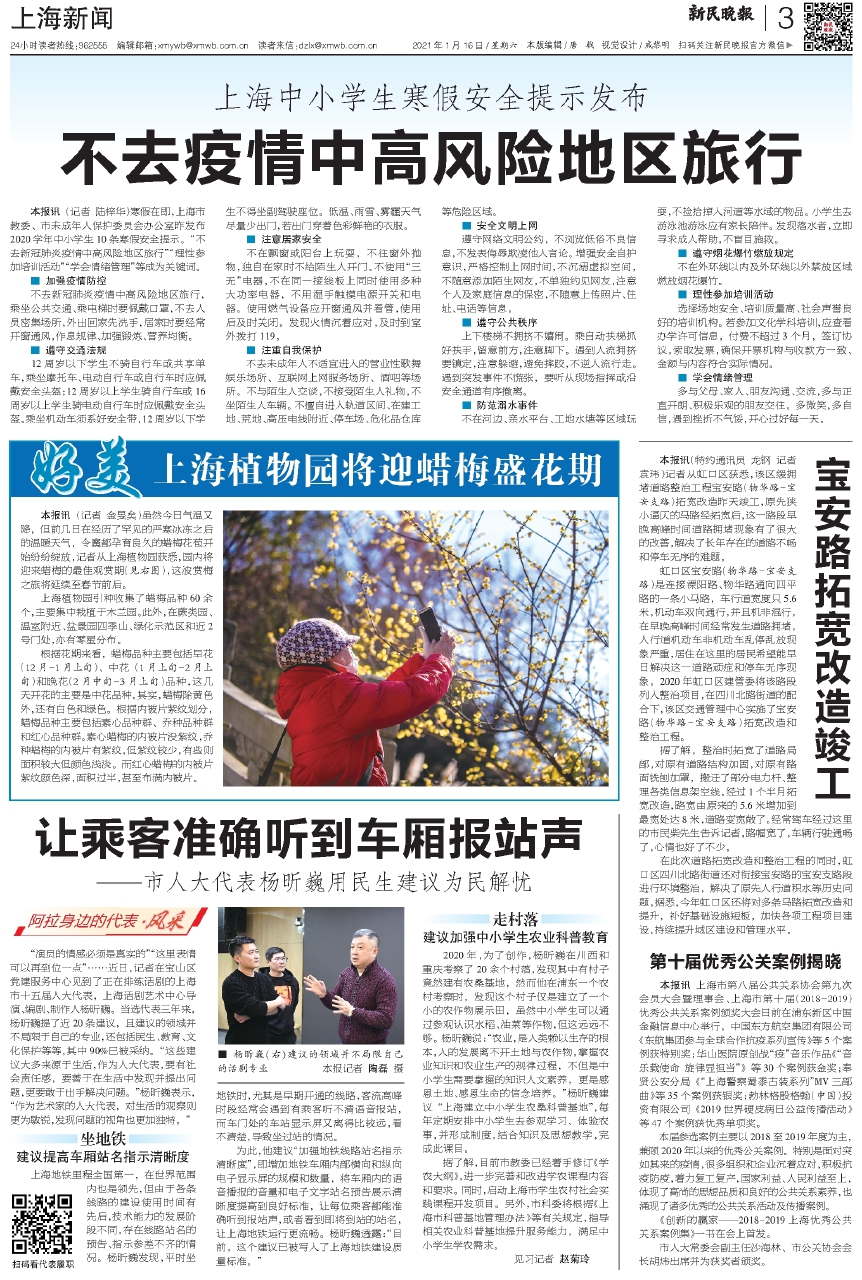 本报讯(记者 陆梓华)寒假在即,上海市教委、市未成年人保护委员会办公室昨发布2020学年中小学生10条寒假安全提示。“不去新冠肺炎疫情中高风险地区旅行”“理性参加培训活动”“学会情绪管理”等成为关键词。
