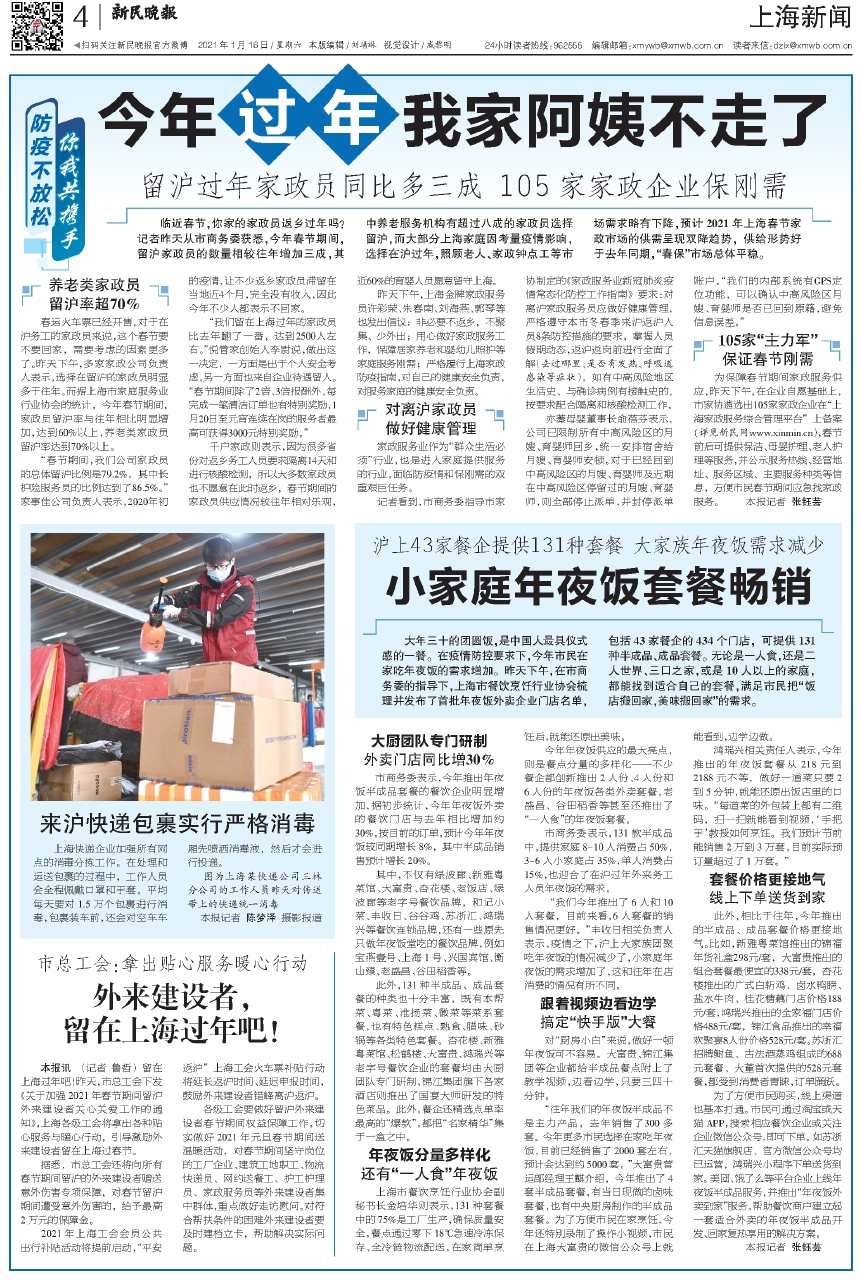 临近春节,你家的家政员返乡过年吗?记者昨天从市商务委获悉,今年春节期间,留沪家政员的数量相较往年增加三成,其中养老服务机构有超过八成的家政员选择留沪,而大部分上海家庭因考量疫情影响,选择在沪过年,照顾老人、家政钟点工等市场需求略有下降,预计2021年上海春节家政市场的供需呈现双降趋势,供给形势好于去年同期,“春保”市场总体平稳。