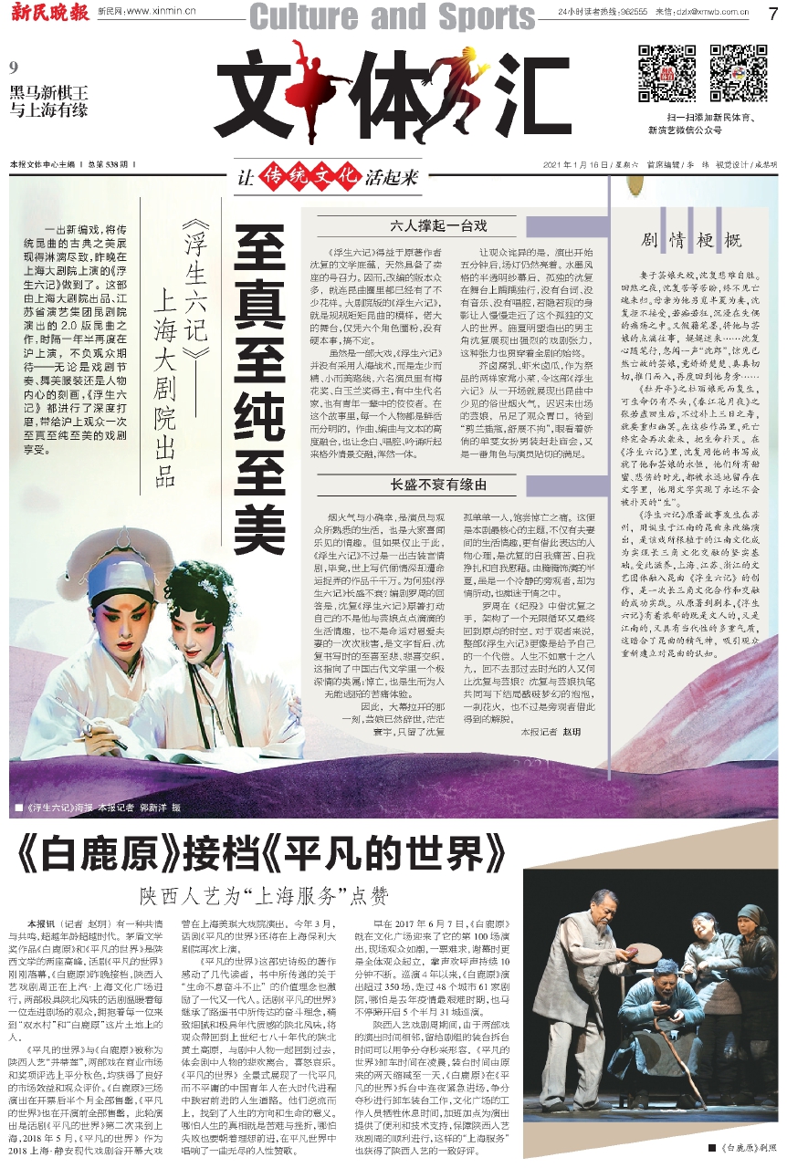 《浮生六记》原著故事发生在苏州,用诞生于江南的昆曲来改编演出,是该戏所根植于的江南文化成为实现长三角文化交融的坚实基础。受此滋养,上海、江苏、浙江的文艺团体融入昆曲《浮生六记》的创作,是一次长三角文化合作和交融的成功实践。从原著到剧本,《浮生六记》有着浓郁的既是文人的,又是江南的,又具有当代性的多重气质,这暗合了昆曲的精气神,吸引观众重新建立对昆曲的认知。