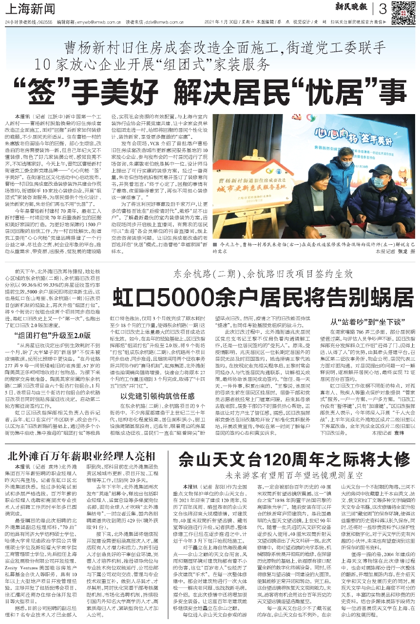 本报讯 (记者 江跃中)新中国第一个工人新村——曹杨新村脱胎换骨的旧住房成套改造正全面施工,面对“回搬”后新家如何装修的难题,不少居民无所适从。住在曹杨一村的朱惠敏老伯面临今年的回搬,却心生烦恼,改造后的老房需要装饰一新,但自己年纪大又不懂装修,物色了好几家装潢公司,感觉良莠不齐,不知选哪家好。今天上午,普陀区曹杨新村街道党工委全新党建品牌——“心心向杨‘签’手美好”,在街道社区文化活动中心启动发布,曹杨一村旧住房成套改造装修装饰共建合作现场签约,街道联手10家放心装修企业,开展“组团式”家装咨询服务,为居民提供个性化设计、装饰新家方案,朱老伯们再也不用“忧居”了。