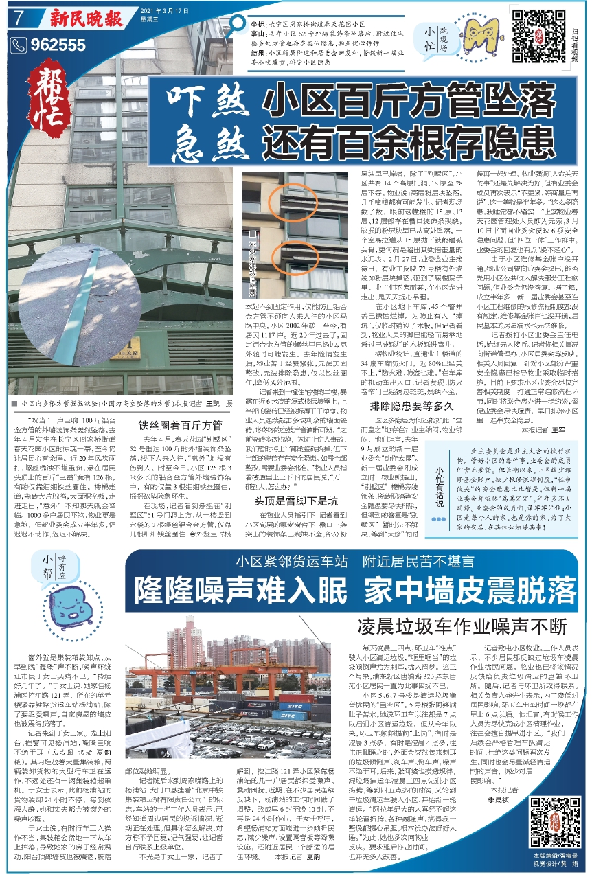事由:去年小区52号外墙装饰条坠落后,附近住宅楼多处方管也存在类似隐患,物业忧心忡忡