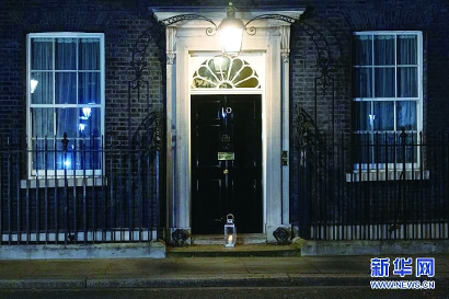 3月23日晚,一盏蜡烛灯摆放在英国伦敦唐宁街10号首相府门前(上图) 新华社发 雷伊·唐 摄