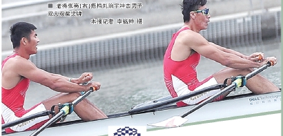 老将张亮(右)搭档刘治宇冲击男子双人双桨奖牌 本报记者 李铭珅 摄