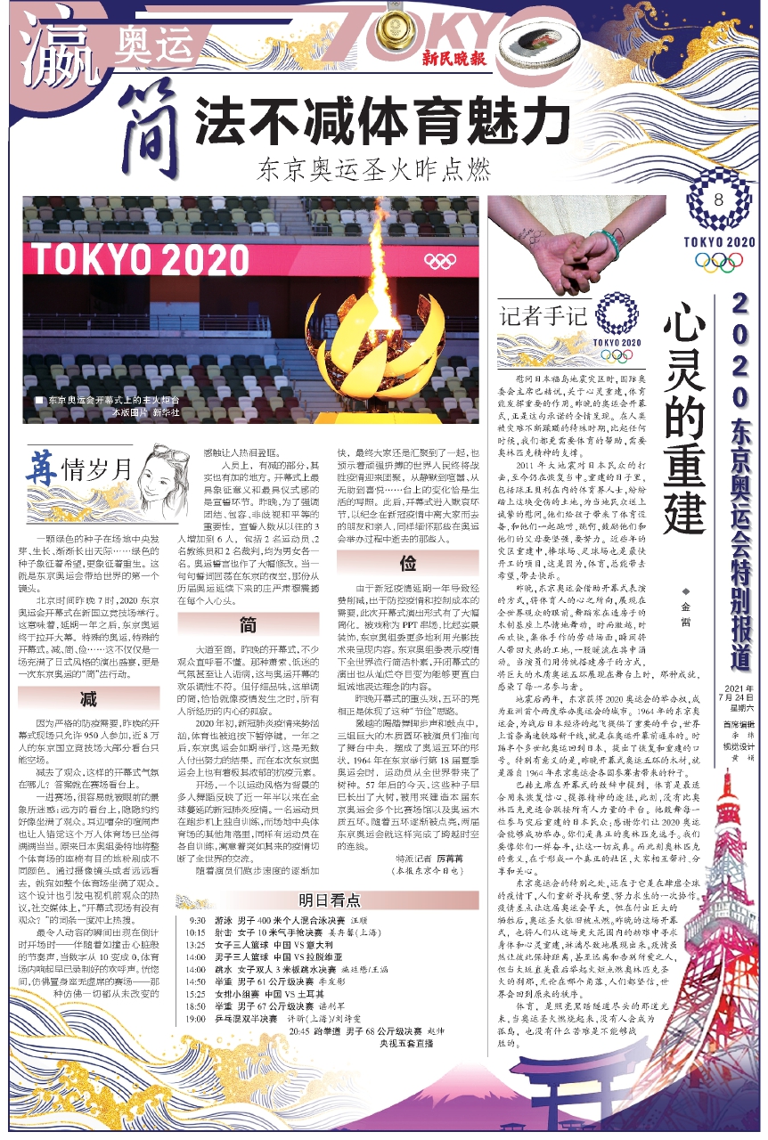人员上,有减的部分,其实也有加的地方。开幕式上最具象征意义和最具仪式感的是宣誓环节。昨晚,为了强调团结、包容、非歧视和平等的重要性,宣誓人数从以往的3人增加到6人,包括2名运动员、2名教练员和2名裁判,均为男女各一名。奥运誓言也作了大幅修改。当一句句誓词回荡在东京的夜空,那份从历届奥运延续下来的庄严肃穆震撼在每个人心头。