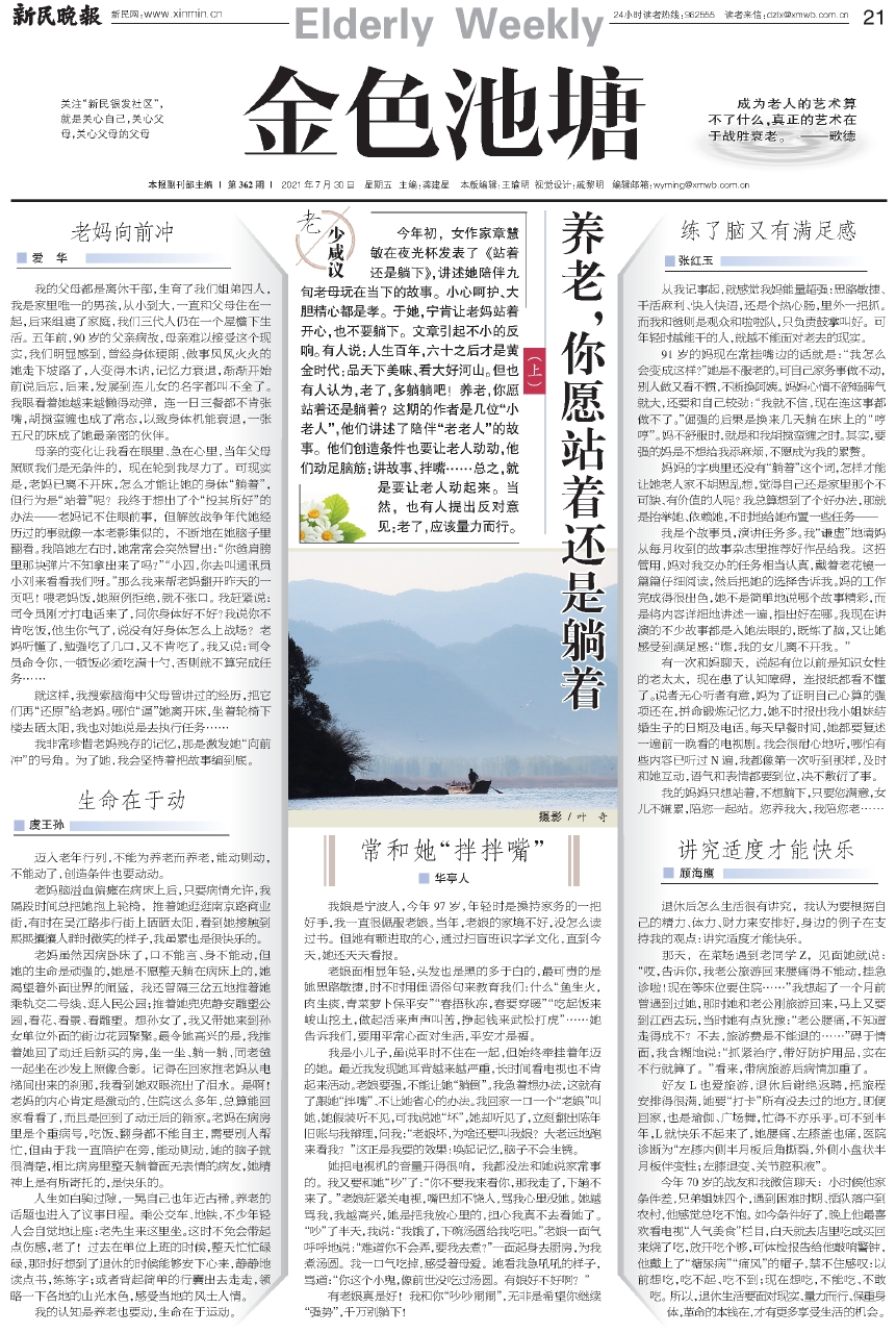 今年初,女作家章慧敏在夜光杯发表了《站着还是躺下》,讲述她陪伴九旬老母玩在当下的故事。小心呵护、大胆精心都是孝。于她,宁肯让老妈站着开心,也不要躺下。文章引起不小的反响。有人说:人生百年,六十之后才是黄金时代:品天下美味、看大好河山。但也有人认为,老了,多躺躺吧!养老,你愿站着还是躺着?这期的作者是几位“小老人”,他们讲述了陪伴“老老人”的故事。他们创造条件也要让老人动动,他们动足脑筋:讲故事、拌嘴……总之,就是要让老人动起来。当然,也有人提出反对意见:老了,应该量力而行。