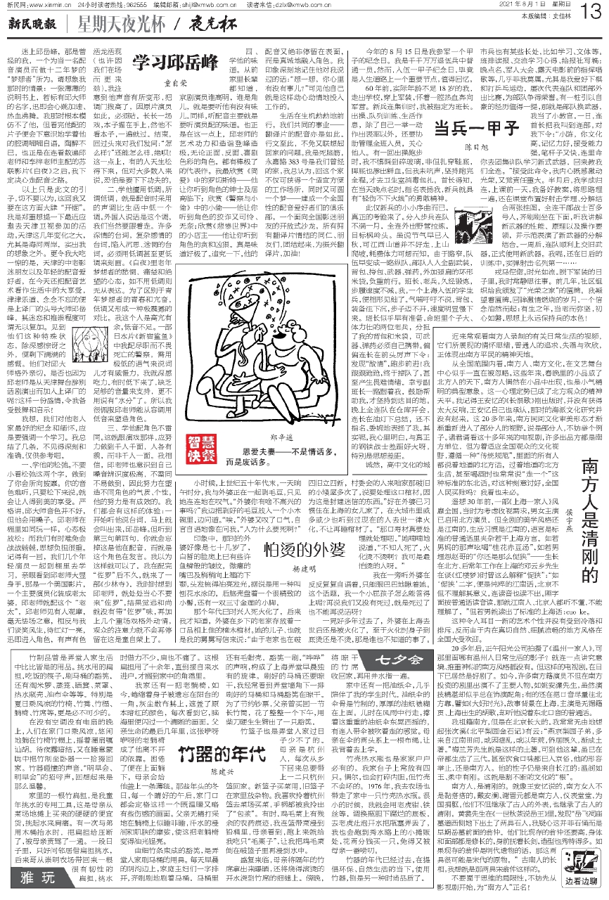 一、学他的松弛。不要小看松弛这两个字,做到了你会所向披靡。你的音色难听,只要松下来说,就会让人得到美的享受。严格讲,邱大师音色并不好,但他会用嗓子。邱老师在棚里如同玩一样,心态极放松;而我们有时难免会战战兢兢,思想负担很重。记得有一回,我们几个年轻演员一起到棚里去学习,亲眼看到邱老师大显身手。那是一个美国影片,一个主要演员化装成老太婆,邱老师就配这个“老太”。邱老师见有人观摩,毫无怯场之意,相反与我们谈笑风生,待红灯一亮,迅即进入角色,有声有色活龙活现(也许因我们在场而更来劲)。我注意到他声音有所变形,把调门拔高了,因原片演员如此,必须贴。长长一场戏,本子握在手上,然他不看本子,一遍就过。结束,回过头来对我们发问:“怎么样?”还能怎么样,绝呗!这一点上,有的人天生松得下来,但对大多数人来说,恐怕是要下下功夫的。
