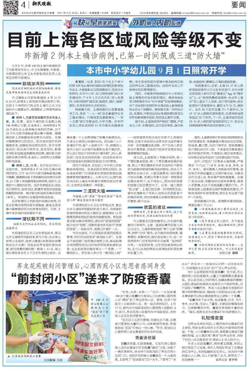 ■病例2,男,30岁。在沪住址为松江区辰丰苑。该病例是8月18日松江确诊病例的朋友,已于18日作为密切接触者落实集中隔离。隔离期间前3次核酸检测结果均为阴性,24日第4次核酸筛查结果异常,后经市、区疾控中心复核为阳性。经市专家组会诊,结合流行病学史、临床症状、影像学表现和实验室核酸检测结果,被诊断为新冠肺炎确诊病例(轻型)。该病例已全程接种新冠疫苗。