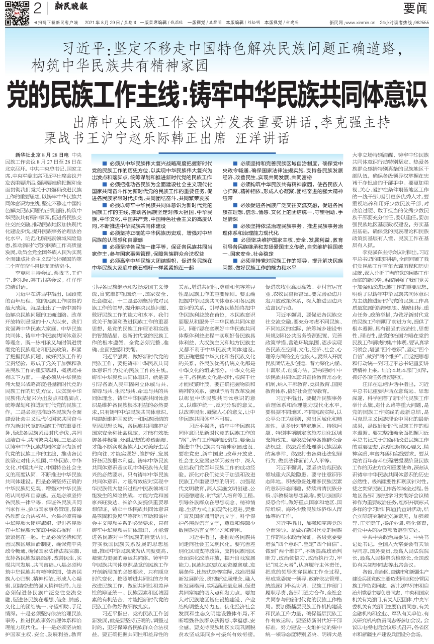 新华社北京8月28日电 中央民族工作会议8月27日至28日在北京召开。中共中央总书记、国家主席、中央军委主席习近平出席会议并发表重要讲话,强调要准确把握和全面贯彻我们党关于加强和改进民族工作的重要思想,以铸牢中华民族共同体意识为主线,坚定不移走中国特色解决民族问题的正确道路,构筑中华民族共有精神家园,促进各民族交往交流交融,推动民族地区加快现代化建设步伐,提升民族事务治理法治化水平,防范化解民族领域风险隐患,推动新时代党的民族工作高质量发展,动员全党全国各族人民为实现全面建成社会主义现代化强国的第二个百年奋斗目标而团结奋斗。