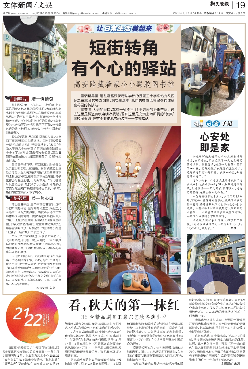 这样贴心的驿站,渐渐也让劳作在这条路上的环卫师傅们敞开心扉。现在,左师傅不那么忙时,也会步入驿站,看看老朋友在捣鼓的那些胶片和唱片机,虽然总笑说“听不懂”却也分明在乐声中流连。而隔壁保安室的小俞则更胆大些,他会和于宗义交流“探访”心得:“黑胶唱片我是真听不懂,但你们挂的画都不错,很有意思。”