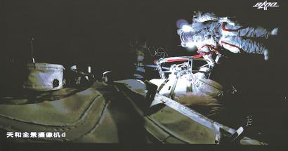 7月4日,在北京航天飞行控制中心大屏拍摄的神舟十二号航天员首次出舱工作画面 新华社记者 金立旺 摄