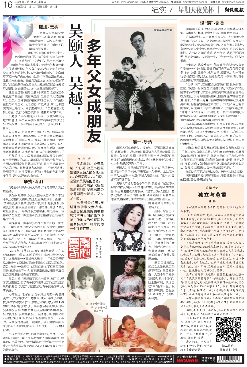 很多年前,介绍吴越,人们说,这是书画篆刻名家吴颐人的女儿;后来,介绍吴颐人,人们说,这是演员吴越的爸爸。