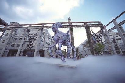 展览的每一个晚上,艾厂门口有一只近10米高的“虚拟生物”会被点亮,在园区内红色摇摆不定的灯光和弥漫的蒸汽衬托下,这只“怪兽”带上了些许“占领地球”的魔幻想象。本报记者 徐翌晟