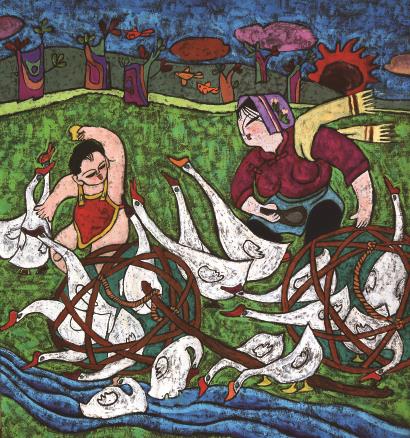 “新泾镇上世纪90年代以前是城乡结合部,受海派文化、农耕文化的影响,形成了独特的文化历史,这就是新泾镇的文化特色和文化品牌,所以画作看上去会像油画。”新泾镇社区文化事务中心主任高峰介绍,西郊农民画最大的特点是稚拙可爱。《童鹅趣》画的是牧鹅的女人和孩子,胖嘟嘟的小孩活泼好动,丰乳肥臀的女性是当时的审美。人物着装是新泾原住民的着装。鹅作为原住民看家护院的家禽,是原住民崇拜的对象,他们也是以养鹅作为家庭富裕的标准。新泾镇以前是上海粮食种植的重要基地,《插秧图》画的就是人们农耕劳作时的欢快场面。两幅画作都充满着浓厚的生活气息。