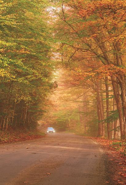 两个小时过后,随着日出温度升高,水汽也渐渐蒸腾,我带领大家赶到山中,但见蜿蜒的小路上薄雾轻漫,阳光透过树林的缝隙给晨雾镀上了淡淡金粉,朦胧中缓缓驶来一辆小车,人们不由得按下快门。