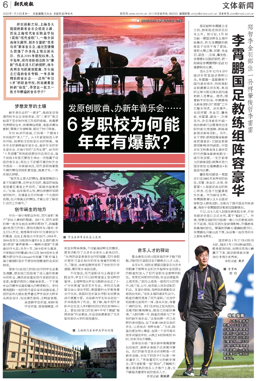 辞旧迎新之际,上海各大院团的新年音乐会接连上演。而在上海现代音乐职业学校(简称“现代音职”),一场全部由师生演绎、别开生面的“美美与共”新年音乐会,通过直播镜头获得了许多线上观众的关注。自从2016年建校以来,几乎每年,现代音职都会因为“爆款”作品走进人们的视野,师生共同参与的原创歌曲、学生独立打造的音乐专辑、一年多场精彩的音乐会……这所“年仅6岁”的职业学校,到底藏着怎样的“秘笈”,孕育出一批又一批才华横溢的音乐学子?
