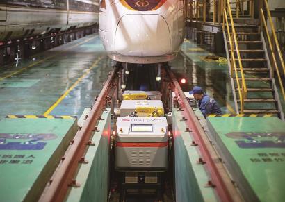 今年春运进行到第六天,在上海虹桥动车所,8台机器人“医生”正为刚刚下线的复兴号动车做检测,这群机器人“医生”在今年升级到二代,一名工作人员通过集控平台便可同时控制8台机器人,并在100分钟内完成动车一级检修流程,针对动车组常见的故障类型,机器人的识别率可以达到90%以上,准确率可以达到100%,大大提高了检修效率,为春运助力。 本报记者 陈梦泽 摄影报道