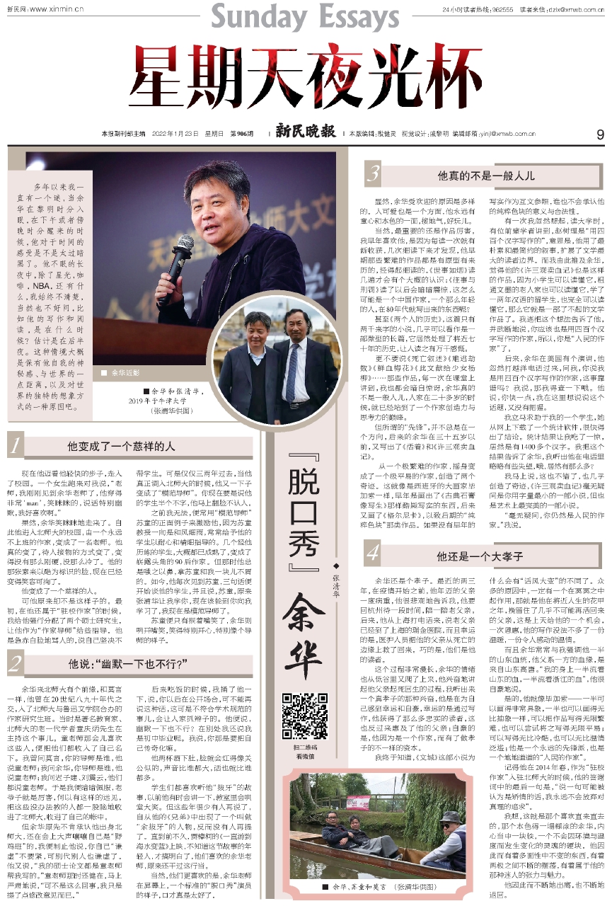 显然,余华受欢迎的原因是多样的。人可爱也是一个方面,他永远有童心和本色的一面,接地气,好玩儿。
