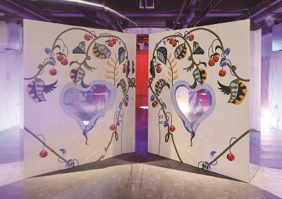 乘坐商场观光电梯抵达4楼,便是本次真我幻镜卡牌新媒体艺术装置展的引言墙。一张小小的卡牌承载着对于未来的发问,结合卡牌与镜面,五种艺术形式将观众引入沉浸式的治愈之旅。进入展厅,看到的是层层递进装置,闪光银色球体和粉色的翅膀,吸引观众沉浸式打卡。
