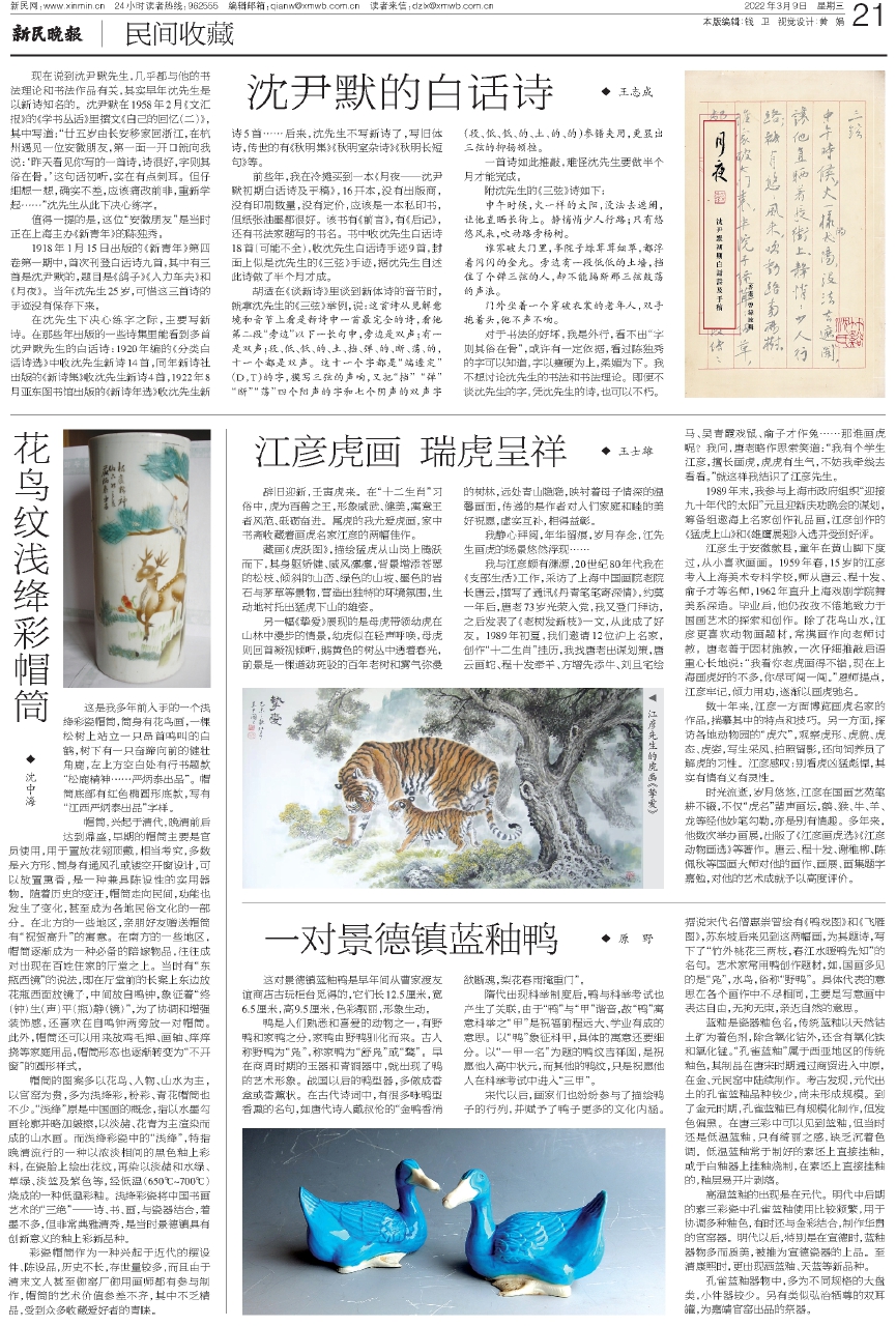 1918年1月15日出版的《新青年》第四卷第一期中,首次刊登白话诗九首,其中有三首是沈尹默的,题目是《鸽子》《人力车夫》和《月夜》。当年沈先生25岁,可惜这三首诗的手迹没有保存下来。