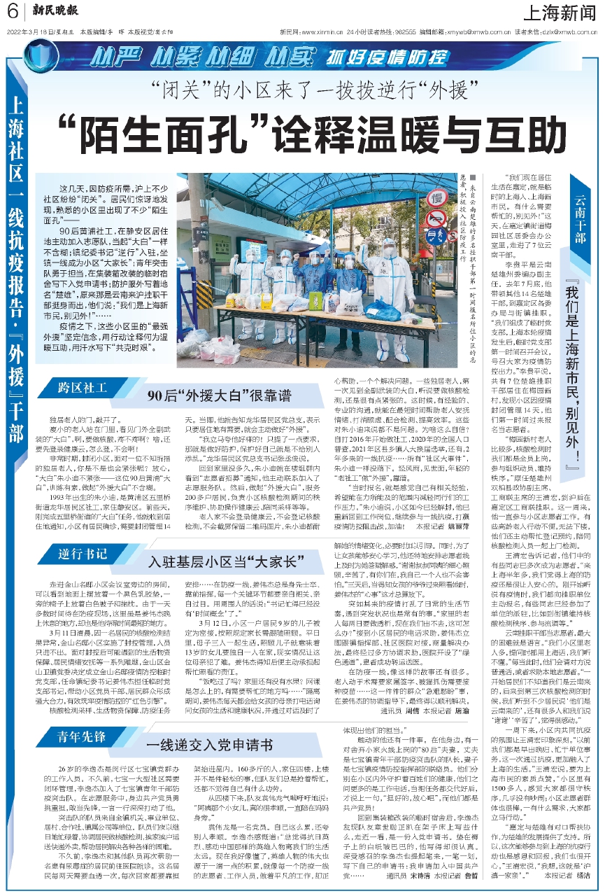 90后黄浦社工,在静安区居住地主动加入志愿队,当起“大白”一样不含糊;镇纪委书记“逆行”入驻,坐镇一线成为小区“大家长”;青年突击队勇于担当,在集装箱改装的临时宿舍写下入党申请书;防护服外写着地名“楚雄”,原来那是云南来沪挂职干部挺身而出,他们说:“我们是上海新市民,别见外!”……