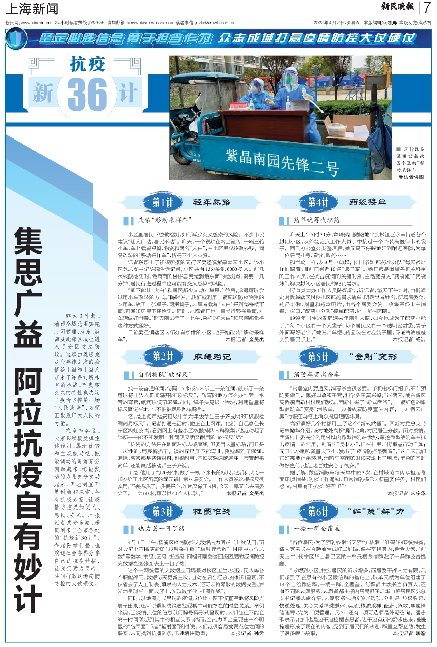 在全市各区,大家都积极发挥主体作用、属地优势和主观能动性,把能调动的资源充分调动起来,把能发动的力量充分发动起来,因地制宜开展创新和探索,各有抗疫妙招,让疫情防控更加便民、惠民、安民。本报记者兵分多路,采集到来自全市各处的“抗疫新36计”,今起陆续刊登,也欢迎社会各界分享自己的抗疫妙招,让我们勠力同心,共同打赢这场疫情防控的大仗硬仗。