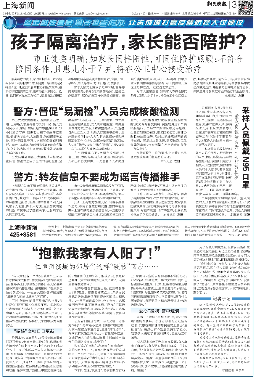 隔离治疗的孩子,牵动家长的心。哪些情况下家长可以陪护?市卫健委一级巡视员吴乾渝介绍,儿童感染者的救治和医学观察,是我们非常重要的工作,也牵动着大家的心。近日,我们再次发出工作提示,要求各定点医院和集中收治点重点关注特殊患者,包括儿童、孕产妇、老人等群体,对他们进行分类收治。