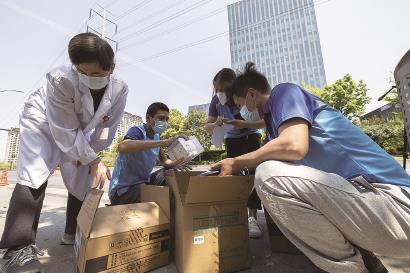 4月12日是“紧急送药专车”上路的第10天。因疫情原因,最近有不少患者取药遇上困难,这项特殊的跑腿业务应运而生。在上海儿童医院,院方联系了平台企业,“紧急送药专车”承接需求。骑手田丹和两位同事接到任务后赶到医院,从医生手中接过药品后仔细核对,踏上送药之路。 图为儿童医院的医生早已将需要配送的药品打包好,装上推车送出医院。骑手们拿出表格核对地址,确认后各自出发本报记者 萧君玮 陈炅玮 摄
