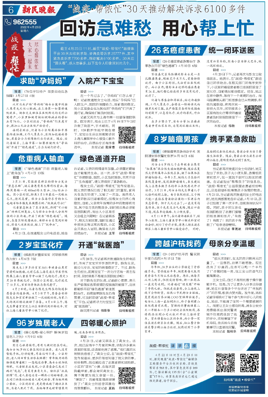 截至4月23日11时,新民“战疫·帮侬忙”融媒体平台30天共收到求助、咨询类等诉求25777件,其中紧急类诉求7700多件,推动解决6100多件。30天后“回头看”,感人故事多,以下是令人印象深刻的几个。