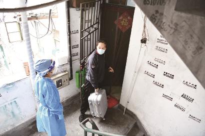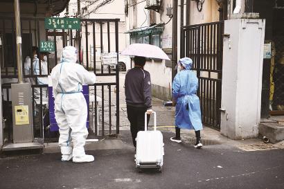 张女士在居委会工作人员陪伴下进入小区 本报记者 萧君玮 孙中钦 陈炅玮 摄影报道