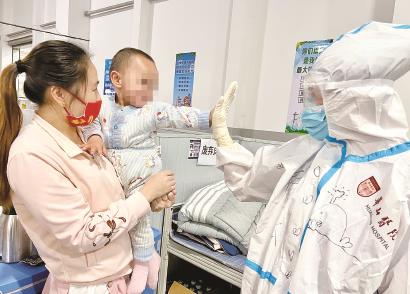 今天一早,在上海临港方舱医院,来自复旦大学附属华山医院的秦晓菁医生和两岁的患儿勇勇击掌互动。经过临港方舱医护人员的悉心照料和治疗,孩子和父母的症状已经得到明显缓解,即将康复出舱。“我既是母亲也是医生,每当看到有孩子入舱,都会觉得心疼。希望大家一起努力,尽快战胜疫情,早日解封,孩子们能自由玩耍。”秦晓菁说。本报记者 刘歆 摄