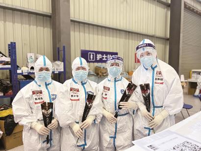 在舱里工作时,费小琴也收到了鲜花,她和当值的“妈妈大白”在护士站留下了一张特殊的合影。