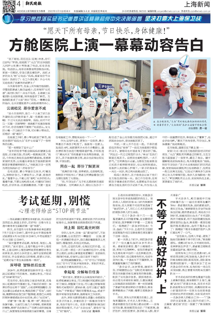 “往年的母亲节都会陪妈妈和婆婆去逛逛街、买买新衣服,然后吃一顿美食回家。”她说,今年她还身处抗击疫情的最前线,很感谢家里的支持,让她毫无牵挂在方舱医院里照顾更多需要被照顾的人。“待凯旋之日一定再为两位妈妈补过一次母亲节!”