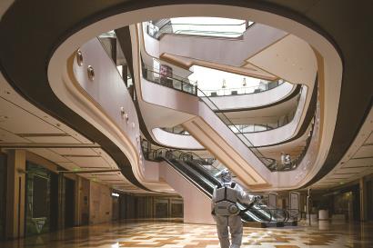 商场里,工作人员正用喷雾枪和沾有消毒液的抹布对电梯扶手和栏杆进行擦拭消毒,还有穿戴防护服和面屏的工作人员背着消毒弥雾机开展消杀(上图)。