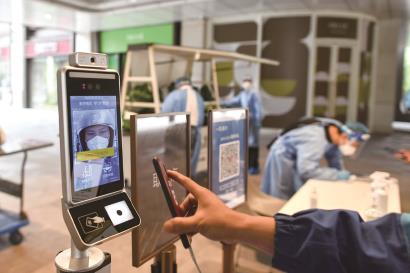 今天上午,记者在兴业太古汇北门1楼取餐点看到,“数字哨兵”已经就位,外卖小哥通过验证和测温,扫“场所码”,并以无接触方式取餐(左图)。