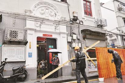 上午9时,细雨绵绵,黄浦区老城厢文庙路上传来哐哐的敲击声。两位穿雨衣的工人正在拆除文庙路沿街的隔离挡板。