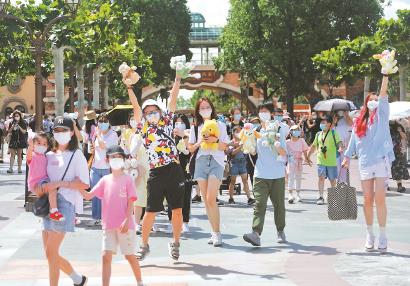 上午,游客们迈着欢乐的步伐,高举心爱的玩偶,走进迪士尼乐园 本报记者 周馨 摄