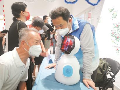 今天上午,“医加医健康机器人”入驻普陀区曹杨新村部分居民区,护卫居民健康。该机器人具有24小时在线诊疗、互联网医院门诊预约、慢病配药等为老服务功能。本报记者 张龙 江跃中 摄影报道