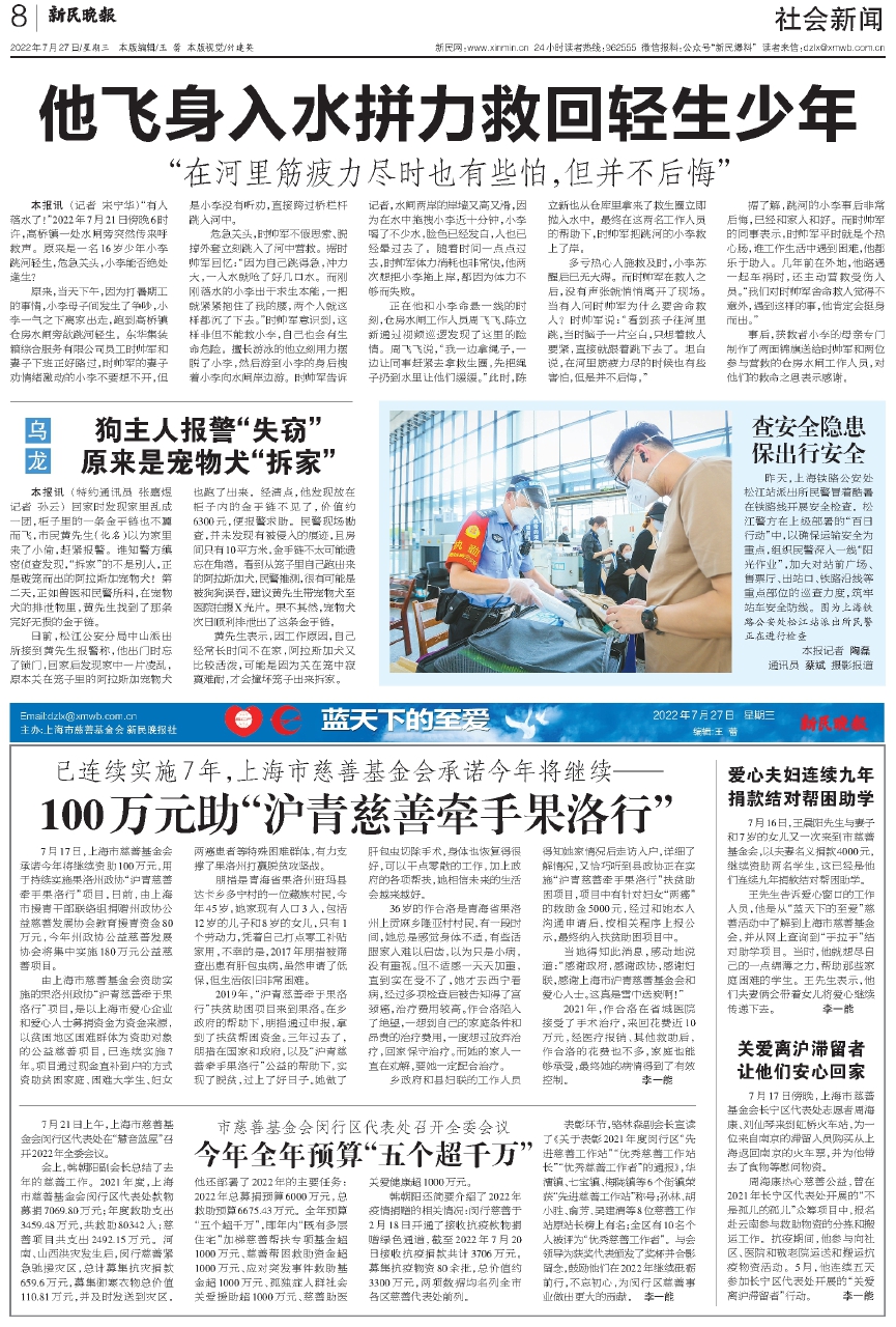 本报讯(记者 宋宁华)“有人落水了!”2022年7月21日傍晚6时许,高桥镇一处水闸旁突然传来呼救声。原来是一名16岁少年小李跳河轻生,危急关头,小李能否绝处逢生?