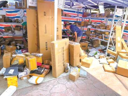 瑞冬小区快递混乱堆放在小区门口 本报记者 季晟祯 摄