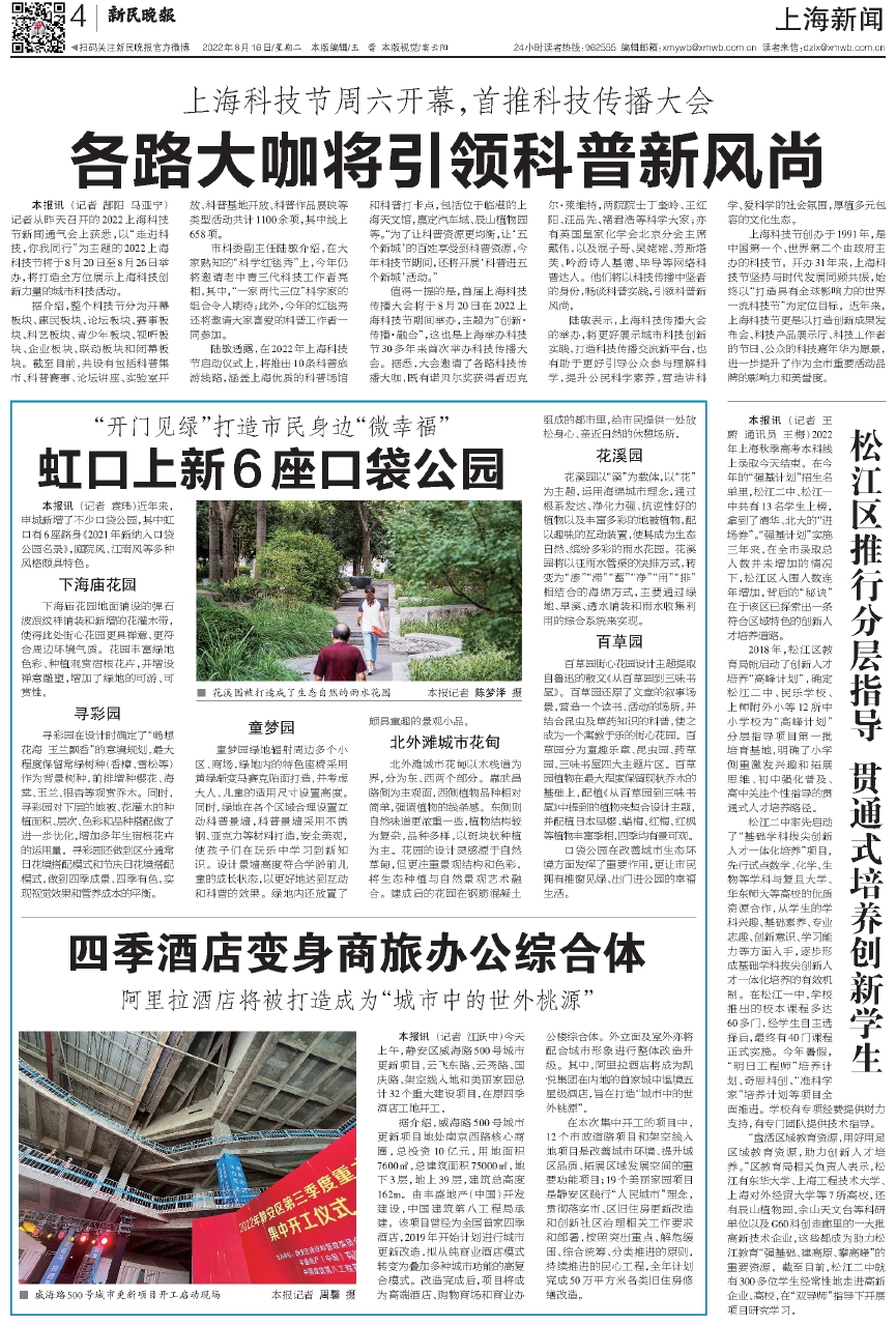 陆敏透露,在2022年上海科技节启动仪式上,将推出10条科普旅游线路,涵盖上海优质的科普场馆和科普打卡点,包括位于临港的上海天文馆,嘉定汽车城、辰山植物园等。“为了让科普资源更均衡,让‘五个新城’的百姓享受到科普资源,今年科技节期间,还将开展‘科普进五个新城’活动。”