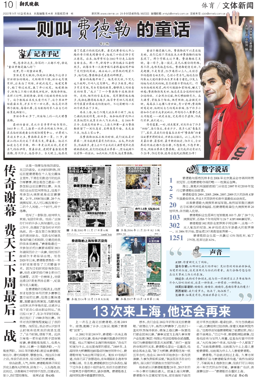 最好的童话,是从朴素寻常开始书写的。2002年11月,上海第一次举办网球大师杯,还是在临时搭建看台的国际博览中心。世界前八角逐王中之王,费德勒是其中一员。21岁,黄浦江的江风吹乱了齐肩长发,带着卷。他还不知道自己有多强。那一年更出风头的,是更有名气的休伊特。圆桌访谈,逮到穿着唐装的费德勒,你问什么,他答什么。当天晚上,他熬夜看了巴塞尔的欧冠比赛。看完比赛索性从华山路的希尔顿走到静安寺,他说门口的石狮子有点意思。后来,他常常怀念2002年行走上海的自由自在。那一年,新闻中心里的瑞士记者特别多。就像当年一大拨中国记者跟着姚明开始了美利坚的周游。瑞士地小,世界级的明星不多,他们说:费德勒会是最亮的那颗星。