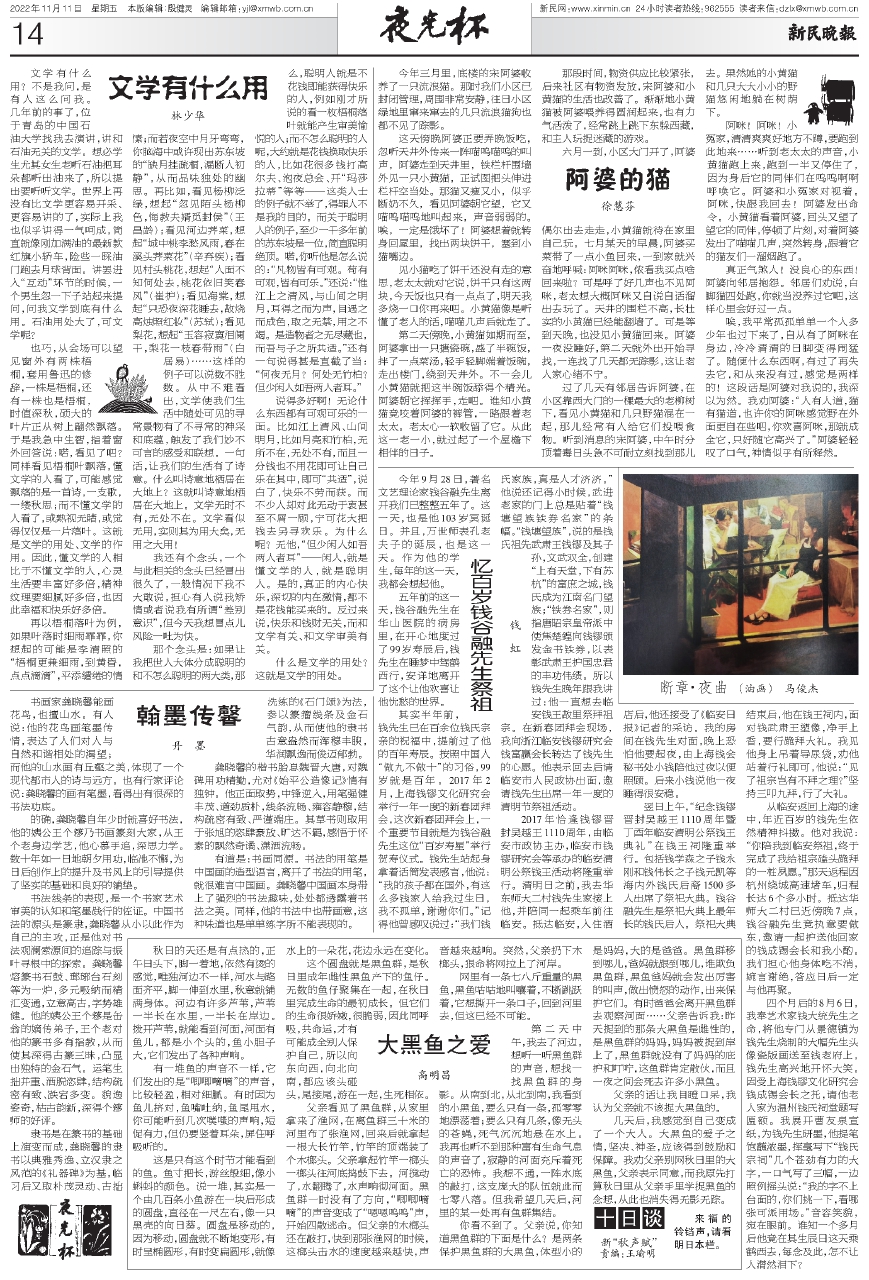 也巧,从会场可以望见窗外有两株梧桐,套用鲁迅的修辞,一株是梧桐,还有一株也是梧桐,时值深秋,硕大的叶片正从树上翩然飘落。于是我急中生智,指着窗外回答说:喏,看见了吧?同样看见梧桐叶飘落,懂文学的人看了,可能感觉飘落的是一首诗,一支歌,一缕秋思;而不懂文学的人看了,或熟视无睹,或觉得仅仅是一片落叶。这就是文学的用处、文学的作用。因此,懂文学的人相比于不懂文学的人,心灵生活要丰富好多倍,精神纹理要细腻好多倍,也因此幸福和快乐好多倍。