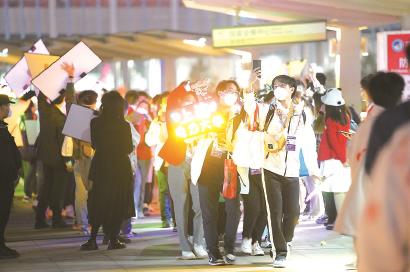 每届进博会落幕之际,“四叶草”东登陆大厅外的天桥都要见证一场青春盛典。昨晚,“小叶子”离园仪式如约在此上演。傍晚6时多,一面面校旗、志愿者队旗在歌声和灯牌中挥舞起来,就像是骄傲地交出一份份漂亮的“成绩单”。来自团市委的统计数据显示,10月25日试运行启动至11月10日期间,共有29931人次志愿者参与岗位实训、“啄木鸟行动”、巡馆及上岗服务。 本报记者 陈炅玮 陆梓华摄影报道