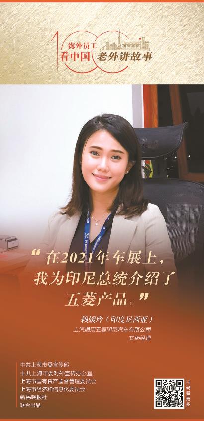 作为印尼华裔,赖媛玲2016年大学毕业后,加入了上汽通用五菱印尼汽车有限公司,负责文秘及相关行政工作。在这6年间,她见证了“中国制造”为印尼人民带来许多与众不同的产品,深感自豪。她喜欢用中文唱歌,喜欢上海体现出的古老与现代交融之美,喜欢自己所在的公司生产的各种受人们欢迎的汽车。