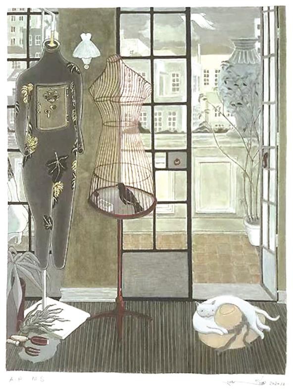 那只自外探入画幅的手,依旧还在。邬达克1927年设计的爱司公寓,被画得宛若精致的芝士千层蛋糕,原是金宇澄为小说《上海水晶鞋》画的配图,曾经作为丝网版画《一幢欧式建筑》展出。这一次展出的版画《爱司公寓》中,捏起公寓的一只手、遮住的小半张女人面孔都还在,却被整体印在了礼品袋上,袋子被另一只手拎起。好似《中国奇谭》里的阳羡书生,故事又套了新的故事。