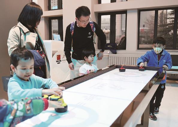 小朋友在赛地首都体育馆体验桌上冰壶 图 新华社