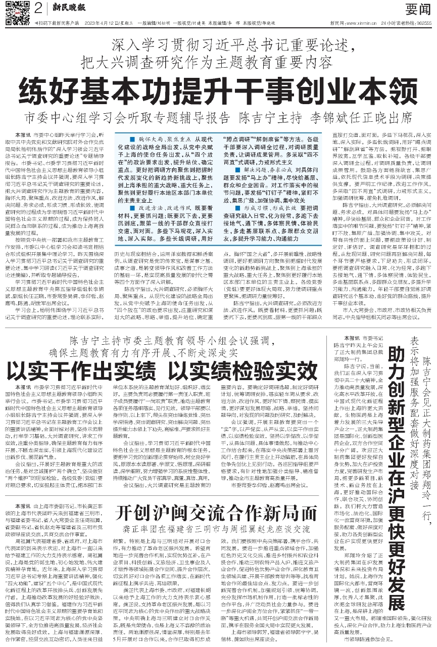 本报讯 市委中心组昨天举行学习会,听取中共中央党史和文献研究院对外合作交流局局长杨明伟所作的“深入学习领会习近平总书记关于调查研究的重要论述”专题辅导报告。市委书记、市委学习贯彻习近平新时代中国特色社会主义思想主题教育领导小组组长陈吉宁主持会议并强调,要深入学习贯彻习近平总书记关于调查研究的重要论述,把大兴调查研究作为主题教育的重要内容,胸怀大局、聚焦重点,改进方法、改进作风,解决问题、务求必成,形成习惯、形成长效,使调查研究的过程成为学思践悟习近平新时代中国特色社会主义思想的过程,成为保持同人民群众血肉联系的过程,成为推动上海高质量发展的过程。