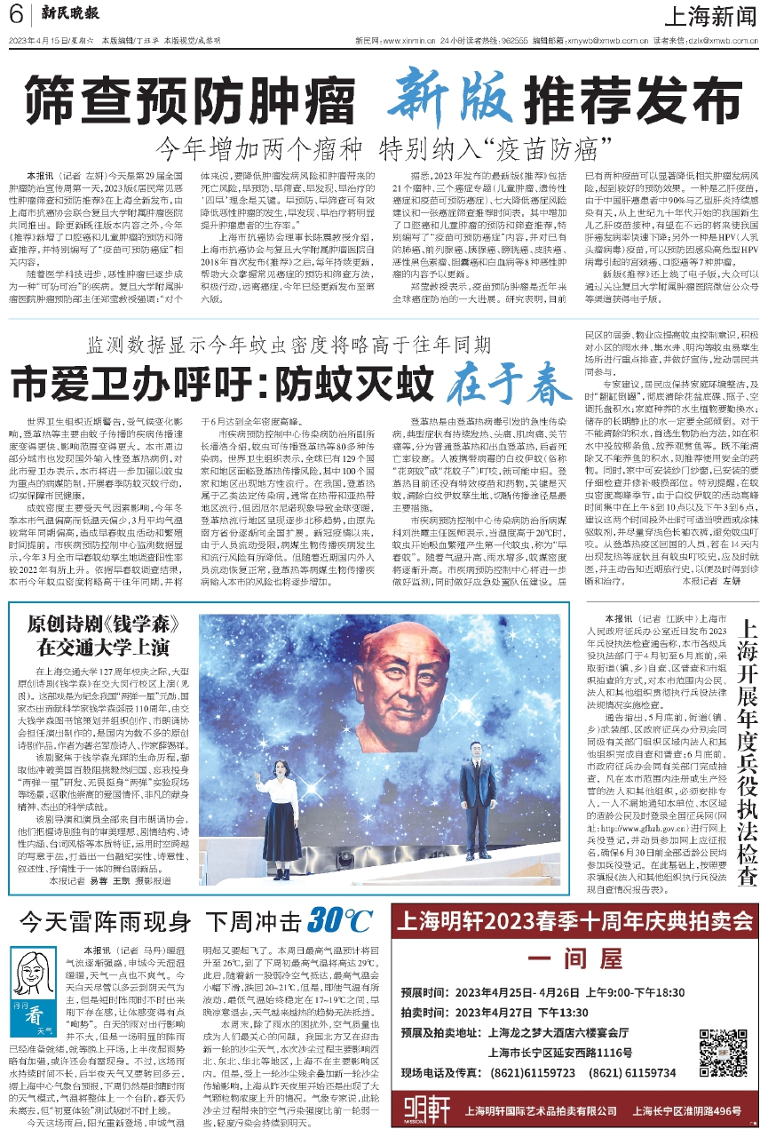 本报讯 (记者 左妍)今天是第29届全国肿瘤防治宣传周第一天,2023版《居民常见恶性肿瘤筛查和预防推荐》在上海全新发布,由上海市抗癌协会联合复旦大学附属肿瘤医院共同推出。除更新既往版本内容之外,今年《推荐》新增了口腔癌和儿童肿瘤的预防和筛查推荐,并特别编写了“疫苗可预防癌症”相关内容。