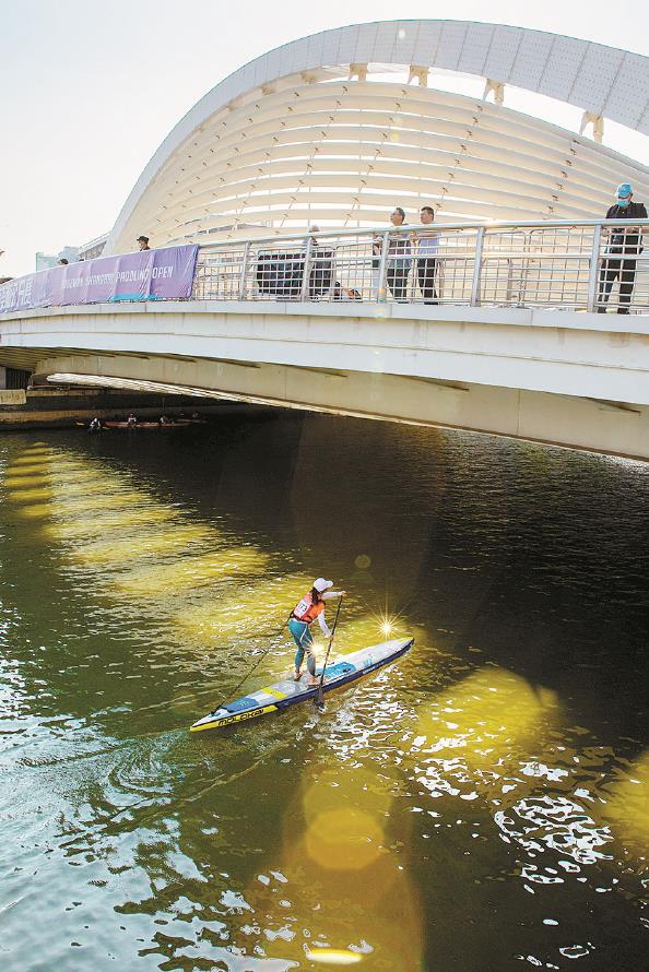 昨天,2023“苏河湾”上海桨板公开赛在苏州河静安段举行,这是桨板比赛首次亮相苏州河本报记者 周馨 摄