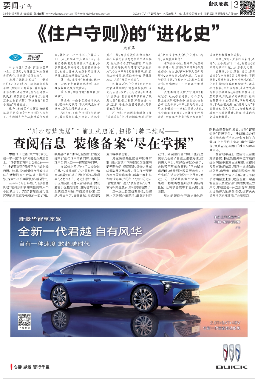 更重要的是,《住户守则》的制定过程,也是普法过程。各个居民区党组织引领居委会、业委会、物业公司以及专家、律师、居民代表,运用三会制度——听证、协调、评议,充分酝酿协商规则,全体业主投票表决,激发各方参与“零距离家园”治理的积极性和创造性。